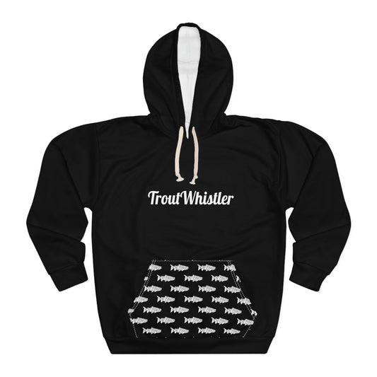 TroutWhistler - AOP Men's Pullover Hoodie | Black w/ White Text & Logos